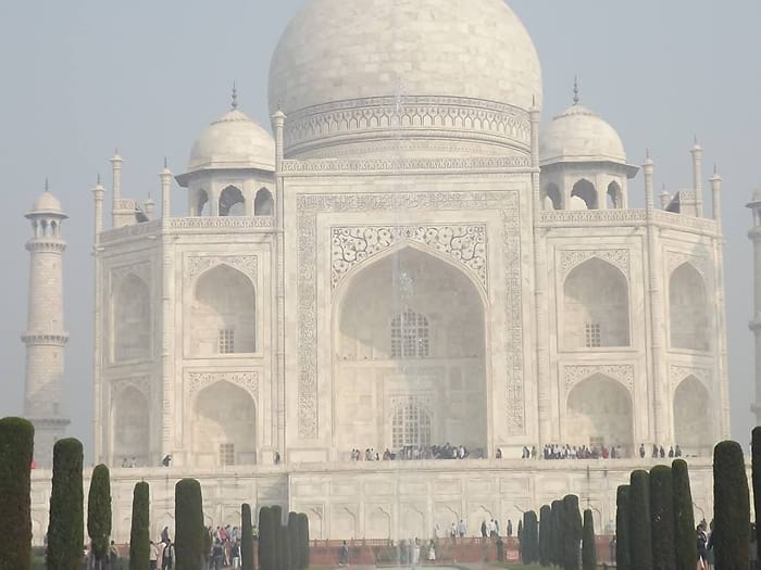 Globalement nous avons alterné nuits dans des hôtels recommandés par le Routard, propres et simples, très abordables, avec des nuits dans des Palais de Rajah, au décor des 1001 nuits, visité des havéli, maisons traditionnelles indiennes, et des Palais ou des forts à l'architecture remarquable et d'une finesse en décalage avec la dureté et la saleté des rues, des routes et des villes. Une mention spéciale pour la Ville sacrée de Pushkar, où la foire aux chameaux battait son plein, comble du dépaysement, du monde grouillant et de la couleur (en voyant les photos on comprend mieux)... Mention spéciale aussi pour Agra et le célébrissime Taj Mahal, qui contrairement aux idées reçues n'est pas un Palais mais un tombeau érigé par un rajah pour sa femme aimée et disparue. Il fait partie des 7 merveilles du monde et n'usurpe en rien cet attribut. Quand on le découvre après avoir passé les imposantes portes et enceintes qui le protègent, on est sidéré, émerveillé, envoûté. Proportions parfaites, finesse et pureté de son marbre blanc, on reste sous le charme longtemps et il a en ce qui nous concerne fini en apothéose notre périple indien.